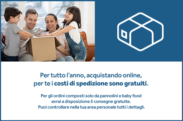 • - 5 consegne gratuite su ordini interamente di pannolino e/o baby food. In caso di ordini misti con tessile, puericultura o giocattolo, le spedizioni rimangono sempre gratuite e senza limite